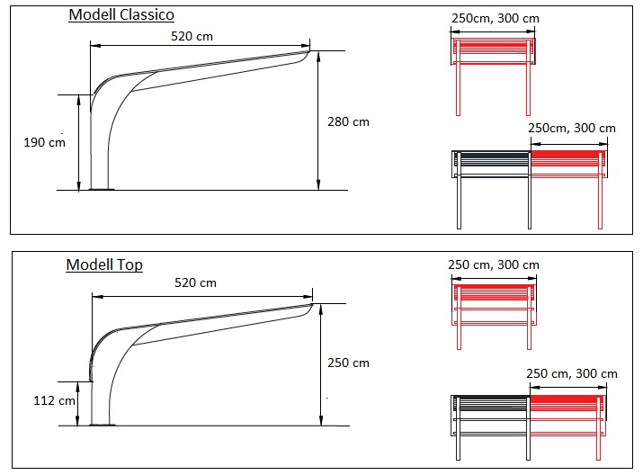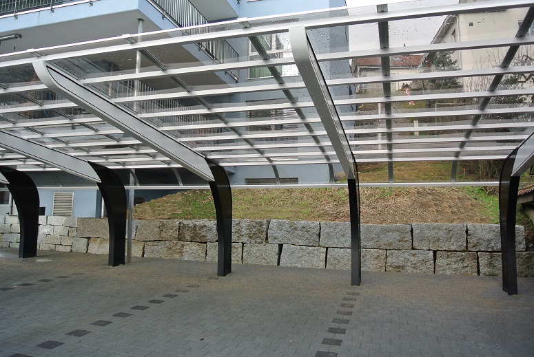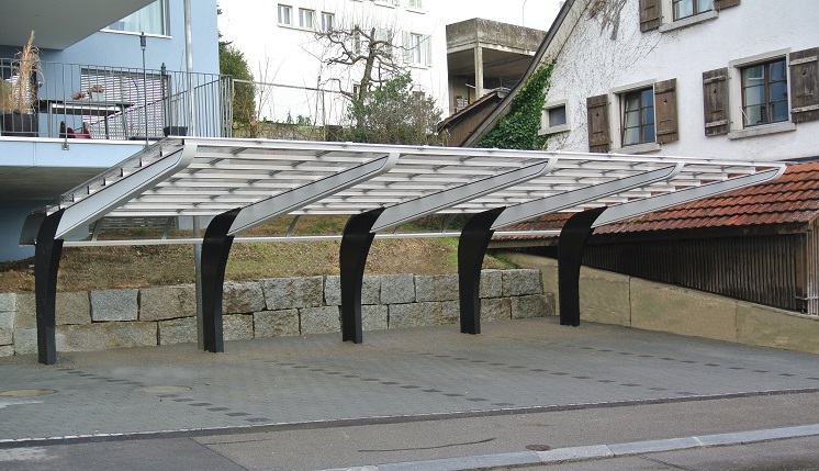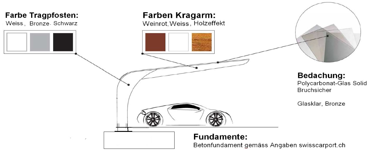 CarShell U Modelle classico und top Die moderne Lösung ohne störende Einfahrtspfösten Tragkonstruktion aus Aluminium Rohrrahmen Verkleidung aus Aluminium-Dipondplatten, erhältlich in verschieden Farb- und Musterkombinationen Bedachung aus bruchsicherem 6 mm Solid Polycarbonat-Glas Je nach Bedürfnissen werden zwei verschiedene Grundmodelle angeboten Zwei verschiedene Höhenmodelle, classico und niedrig, in den Breiten als Einzelcarport von 2.5m – 3.0m Die schmalen Side-Modelle in der Breite vom 3.0 m, für seitliches parkieren mit der max. Länge von 5.5m Andere Masse auf Anfrage Reihenerweiterung möglich Konstruktion wird auf bauseitiges erstelltes Betonfundament montiert Design Tragpfosten und Kragarm sind in je drei Farben erhältlich. Vergrössern Sie das Bild, indem Sie darauf klicken! Dacheindeckung mit Polycarbonat-Glas Solid 6 mm Garantie auf Witterungsbeständigkeit, Hagelbeständigkeit und UV-Stabilität Farben: Glasklar, Opal, Bronze